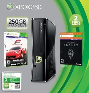 The Annual Holiday bundles are an amazing value. For the same price as the same spec system (amount of memory, Kinect included or not) you get the same system with 2 games. This year, for the 250GB model, they are including a Voucher to Download Skyrim. Important to know and keep in mind if your internet is slow, limited, etc. It also includes Forza 4 Essential Edition. I am not much of a racing game player, so I am not sure if that is what the normal version of the game is called, or if that is a special, some what limited version of the game. You also get the 1 month of Xbox live Gold, 1 wireless controller, and 1 wired headset. It does NOT include an HDMI cable, but instead comes with a set of Composite cables. Some thing to keep in mind, and if you need cables, buy from Amazon AmazonBasics High-Speed HDMI Cable (3 Feet/0.9 Meter) - Supports Ethernet, 3D, and Audio Return [Newest Standard], or at least online. Any brick and mortar store will cost far more for a cable.